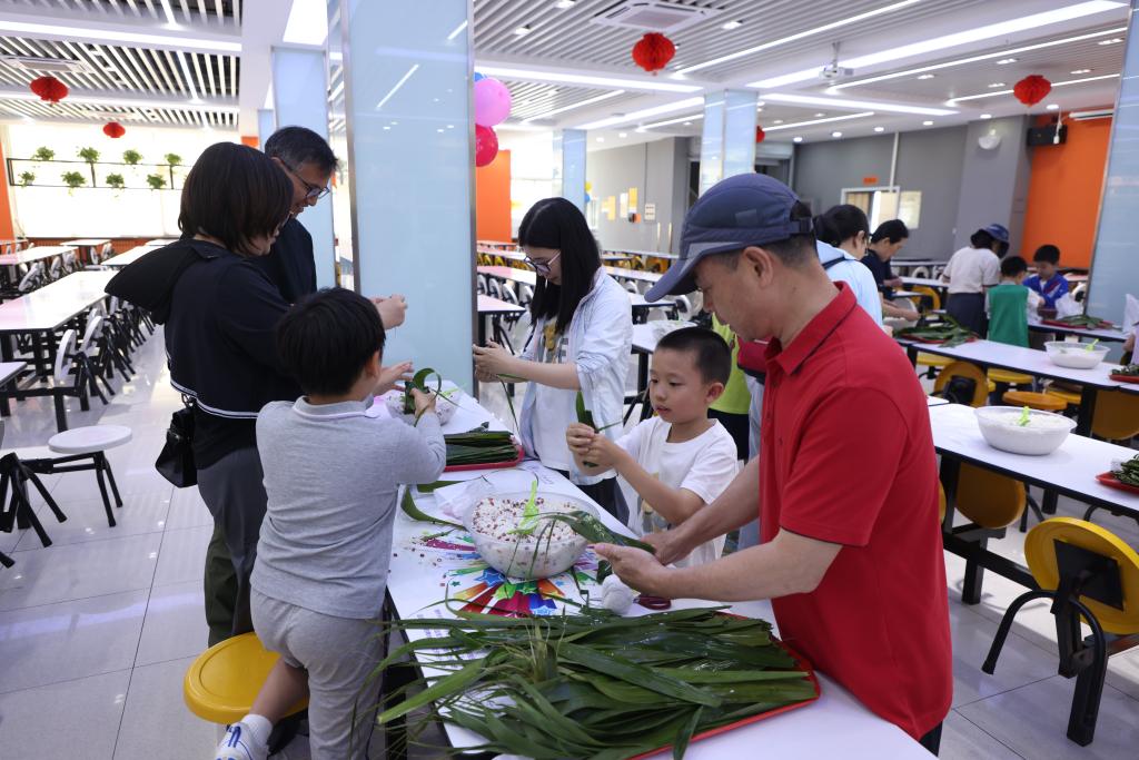 在清晏楼一层,学校食堂特别为大家准备了包粽子的体验活动。在这里,大家可以亲手触摸糯米和粽叶,巧妙地包出一个个可爱的粽子。大家感受传统技艺的魅力,还在欢乐的氛围中培养动手能力。端午节即将到来,老师和家人们在附中食堂一起体验包粽子的乐趣,留下独特而美好的回忆。