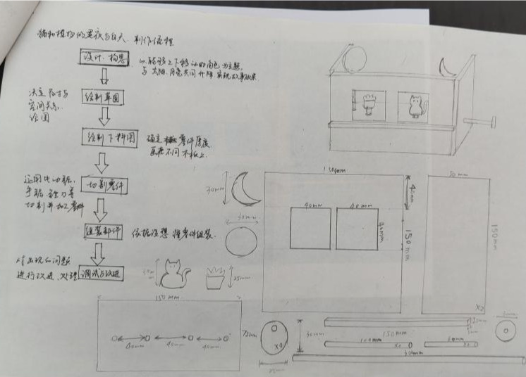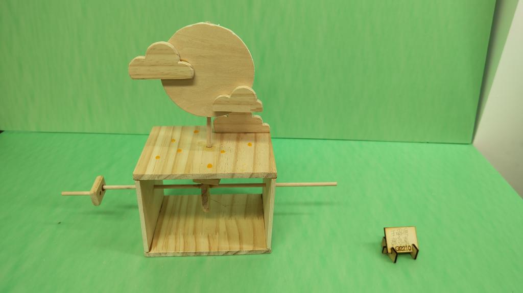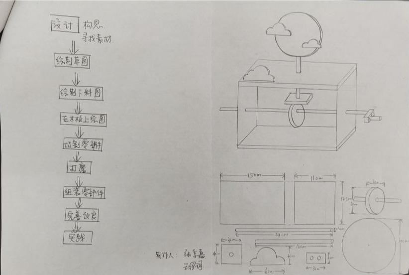 王昭玥同学在设计的过程中,为了让“太阳”随着机械装置稳稳地“升起”在云海之上,她灵机一动,用一根细小的木条作为支撑,并巧妙地用云朵形状将其隐藏在作品中,既美观又实用。