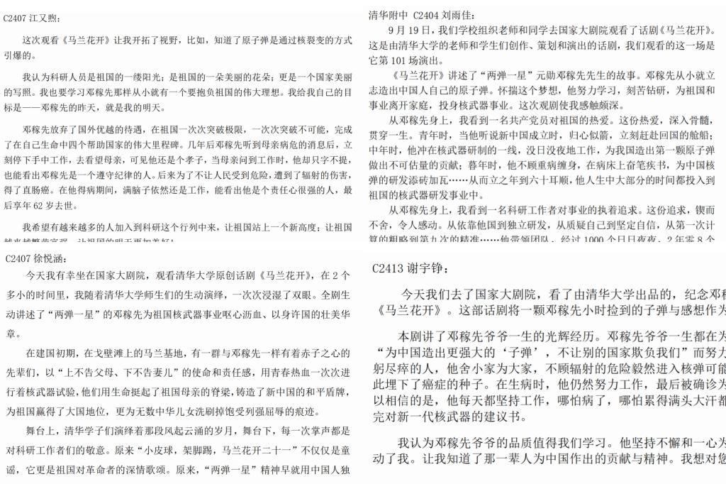 《马兰花开》为观众呈现的不仅是一场艺术盛宴,更是一堂生动的爱国主义思政课,让学生体悟到以邓稼先为代表的我国老一辈科技工作者严谨创新的科学精神、默默无私的奉献精神和崇高伟大的爱国精神。观看结束后,学生们通过观后感纷纷表达自己的所感所悟。