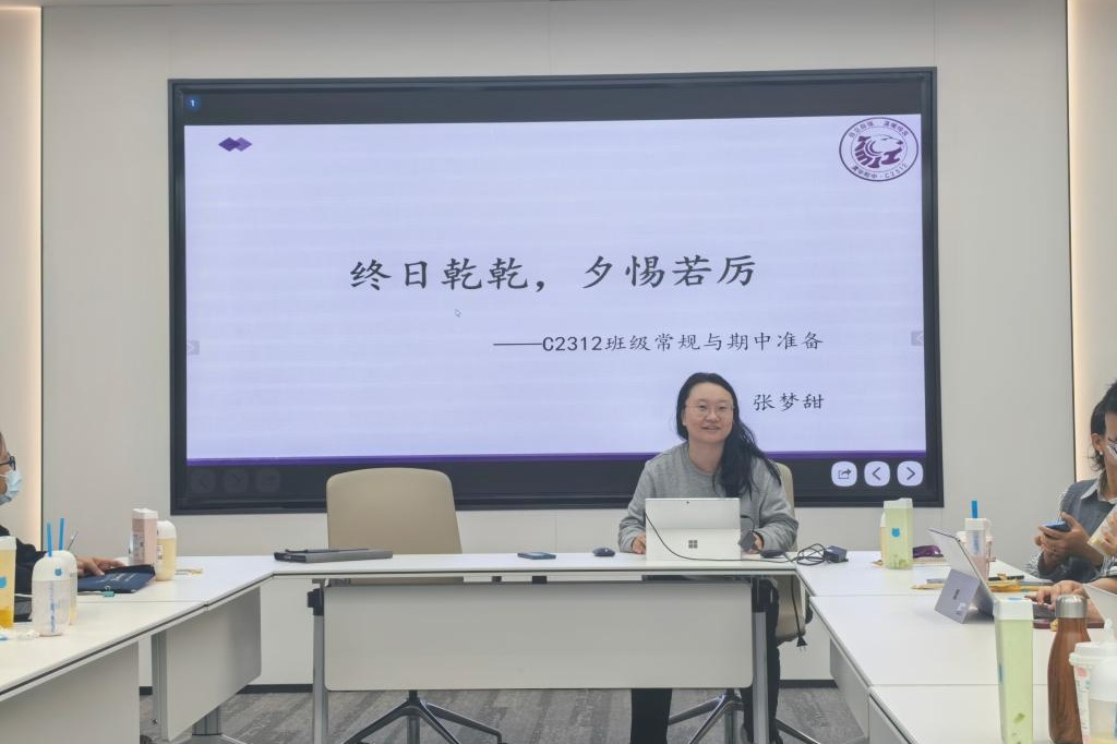 第一位分享的是初23学部班主任代表张梦甜老师。张梦甜老师以“终日乾乾,夕惕若厉”为主题,主要从卫生、早常规、跑操、纪律、成长共同体(小组)五个方面分享班级常规和带班心得,通过明确、简洁、正向的要求,让学生各得其所,使学生得到针对性、成长性改进,同时增加违规成本,营造班级良好氛围,推动班级建设。在期中考试准备方面,张梦甜老师认为,期中前可以借班会进行动员,同时营造学习氛围,期中后主要关注成绩表彰和家校沟通。