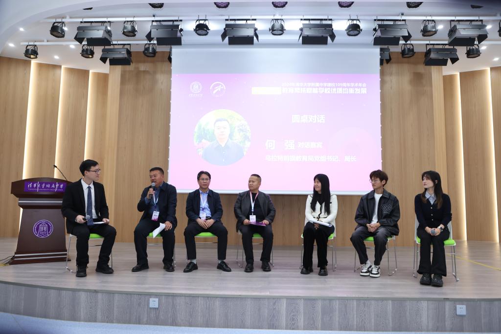 圆桌对话围绕“境、源、情”展开。bg真人试玩党办兼行政管理中心副主任岑逸飞与乌拉特前旗教育局党组书记、局长何强,昭觉民族中学校长鲁文华,扎赉特旗音德尔第一中学副校长赵景林,bg真人试玩文安驿学校副校长王金玉,成志英才培养计划学员代表马率、bg真人试玩高16级支教团学生代表任开颜,共同围绕教育帮扶的成效、挑战、创新策略、个人收获、实践经验、存在问题及未来展望等方面进行了深入交流与讨论,大家在现场真情流露,展现了教育帮扶产生的巨大正能量。