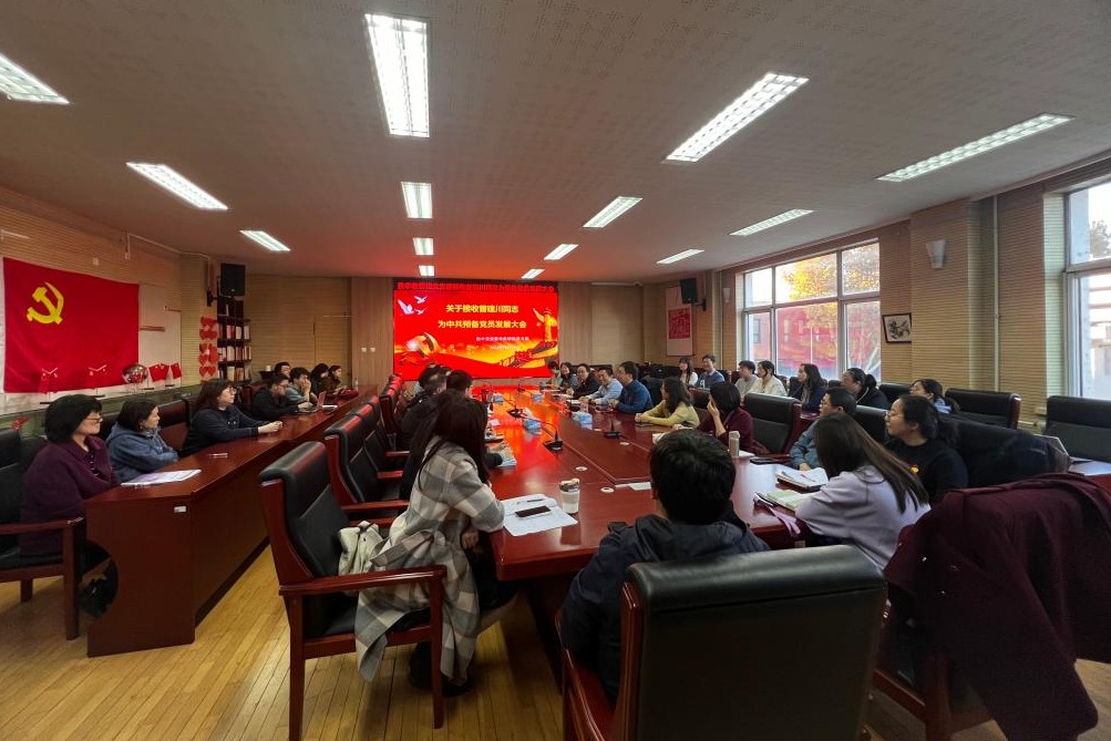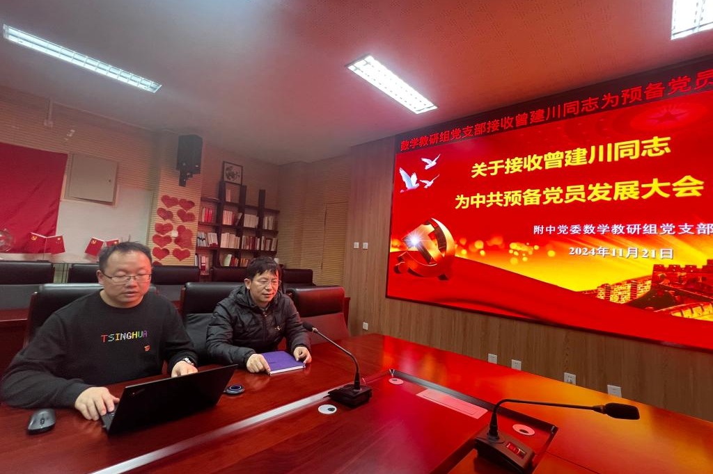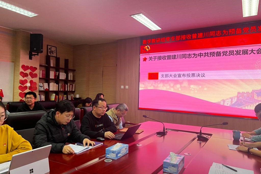 11月21日下午,bg真人试玩数学教研组党支部召开接收曾建川同志为预备党员发展大会。北京市委教育工委组织二处处长杜建峰,bg真人试玩党委书记曹海翔,bg真人试玩党委委员张苏,数学教研组党支部全体党员和入党积极分子、青年教师近40人出席大会,会议由党支部书记李劲松主持。