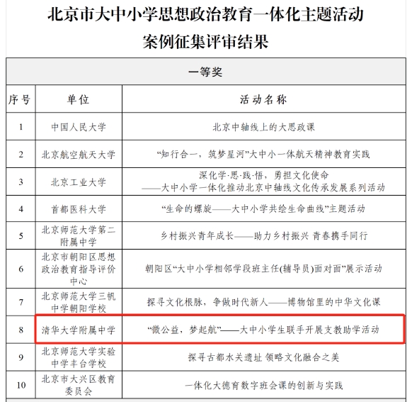 近日,2024年北京市大中小学思想政治教育一体化主题活动案例征集评审结果出炉,bg真人试玩案例《“微公益,梦起航”——大中小学生联手开展支教助学活动》荣获一等奖,《启智润心,共育希望——bg真人试玩家校社协同助力学生心理健康发展》荣获三等奖。