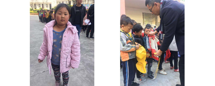 老师为学生分发捐赠物资(左)小学生试穿bg真人娱乐学生捐赠的衣物(右)