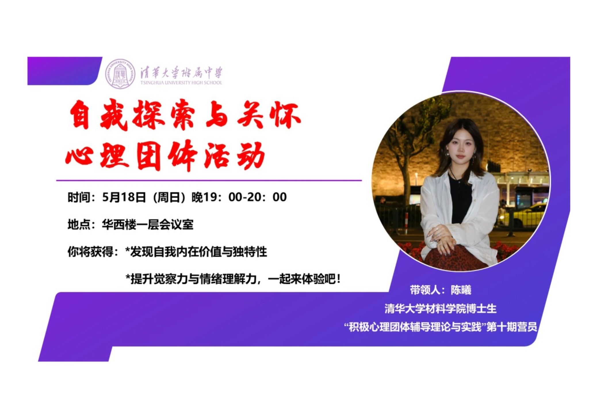 5月18日晚,住宿部在多功能厅举办自我探索与关怀心理团体辅导活动,11名住宿生参与其中。活动由住宿部韩宁宇老师主持,特邀清华大学材料学院博士、“积极心理团体辅导理论与实践”营员陈曦老师主讲。