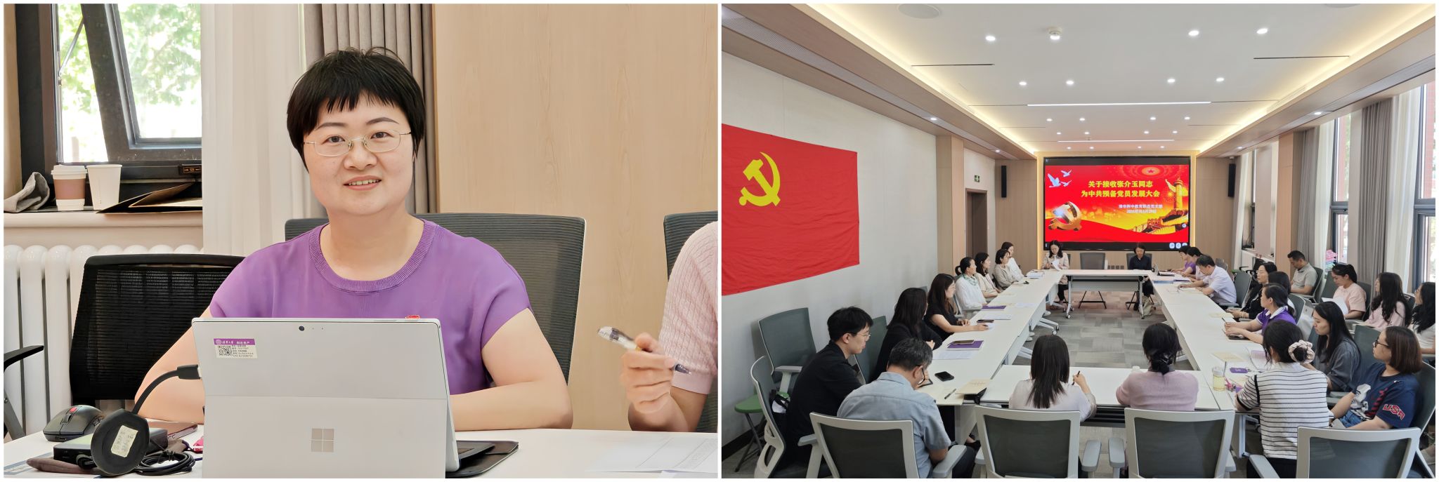 本次发展大会严格按照党组织接收预备党员的程序进行。首先,张介玉同志汇报了自己的基本情况,表明了自己入党的态度和决心。入党介绍人赵欢、张嘉宇两位老师分别介绍了张介玉同志的有关情况,并对其能否入党表明了意见。两位老师认为张介玉同志在思想上追求进步,入党动机端正;在工作中严谨担当,成绩突出,已具备党员条件,同意介绍她加入中国共产党。