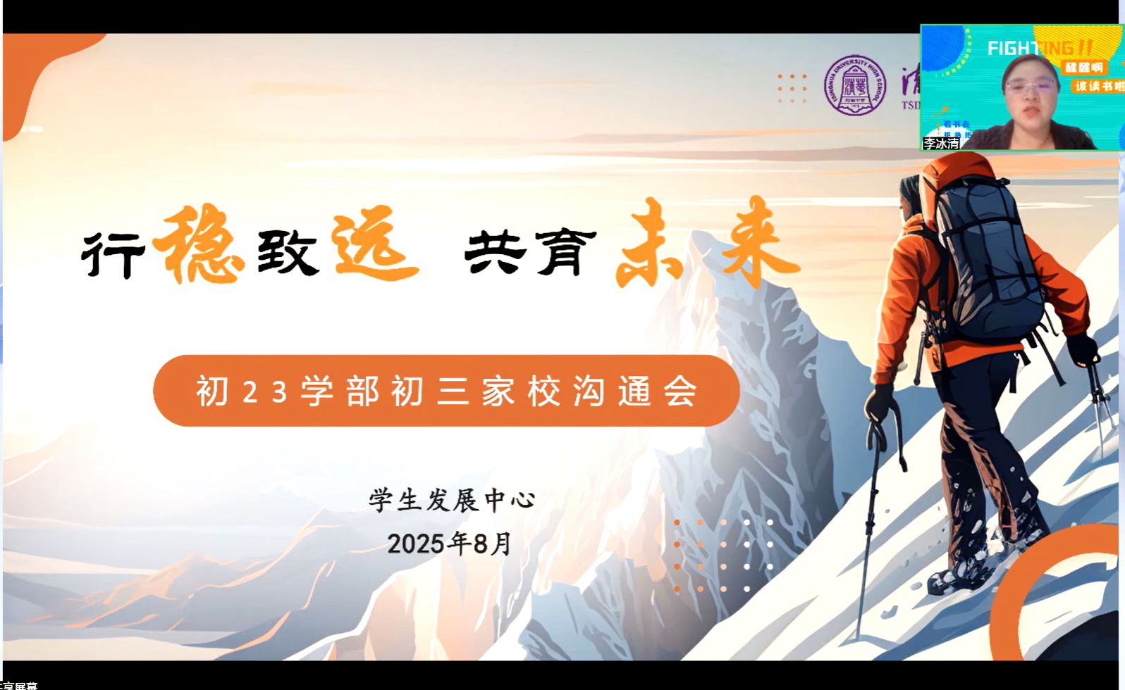 bg真人娱乐初23学部副主任周小玲老师以“事至不惧,徐为之图”为主题,从学部层面为家长介绍初三工作的整体节奏、开学初期的重点安排,以及如何帮助孩子从假期状态高效切换到初三节奏。周小玲老师首先说到,面对初三的到来和各种变化,家长和孩子们都不要慌乱,把心静下来,才能更好地应对和表现。她同时说明了初三之后学校和学部的整体规划,也提出对于学生和家长的各项要求与期待。学生要及早收心、学习用心、但求尽心,也要保持健康和阅读;家长要调整姿态、协助培养、关注孩子、形成家校合力。最后,借用曾国藩“结硬寨,打呆仗”的战略思想,希望家长和学生都可以戒骄戒躁,沉着冷静地面对初三。