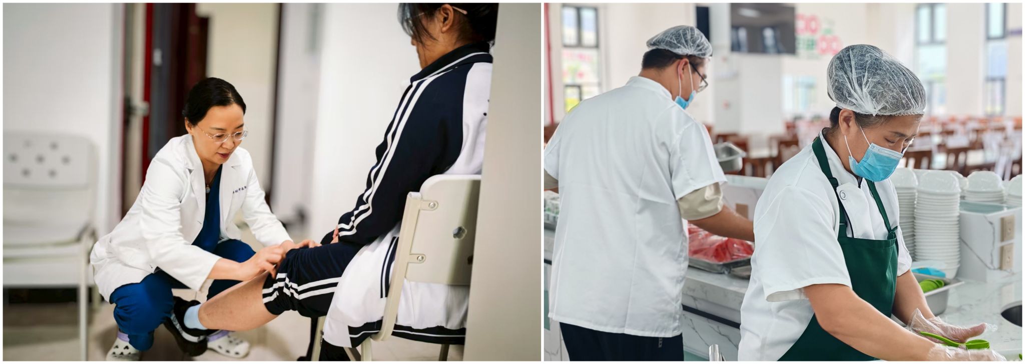 医务老师为受伤同学进行治疗、食堂工作人员进行开餐前准备