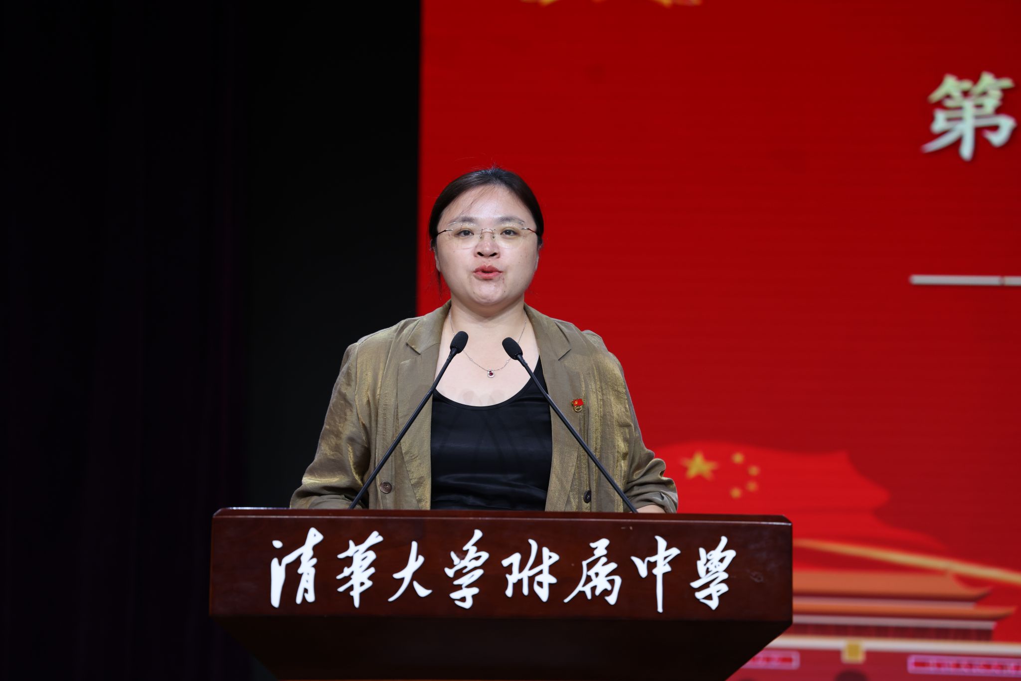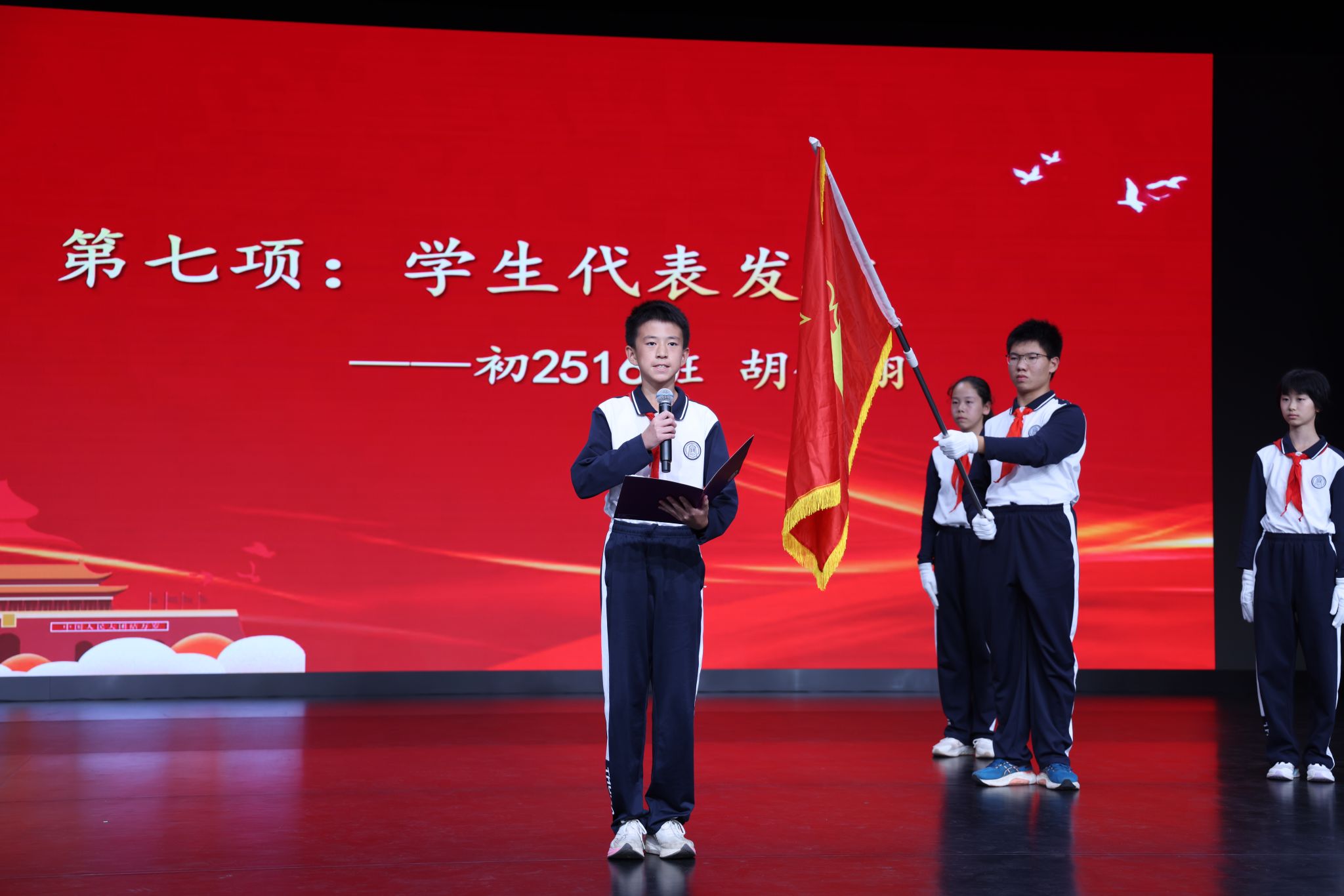 仪式上,学生发展中心副主任李冰清宣读初25学部建队决定。在热烈的掌声中,bg真人试玩副校长张苏与初25学部主任那妮老师为各中队授中队旗,接过队旗的中队长们昂首挺立,肩负起引领中队成长的责任。初2516班胡钊翔作为少先队员代表上台发言,他分享了对加入少先队的憧憬与期待,表达了传承国防精神、勇担少年使命的坚定信念。