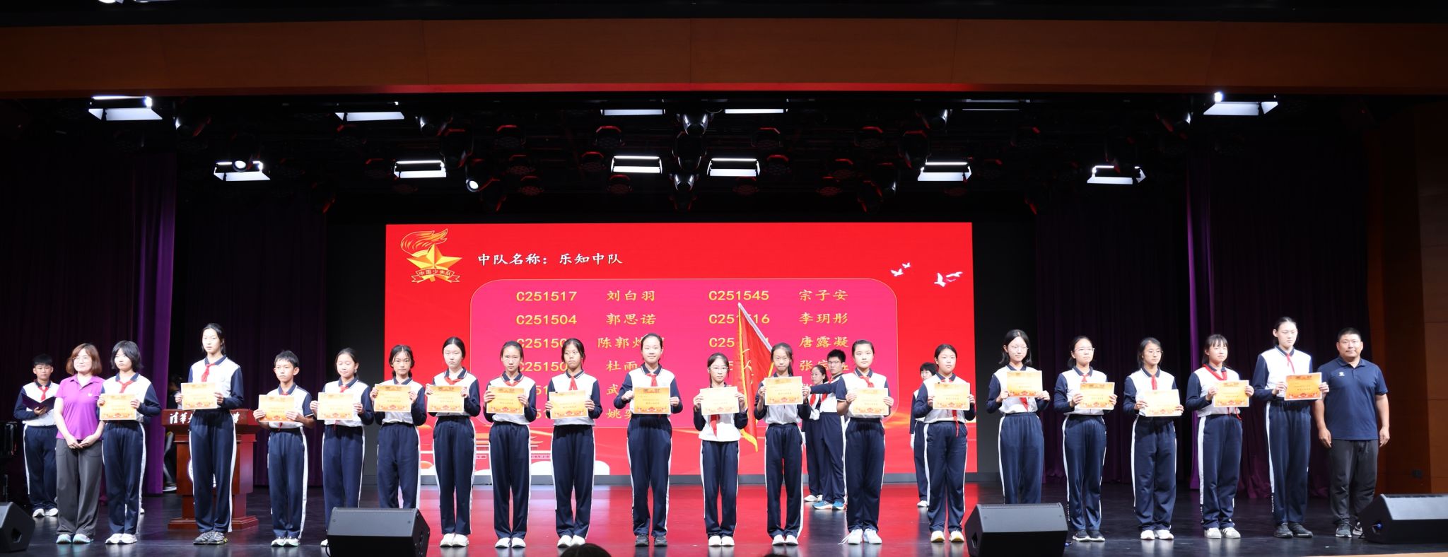 为感恩师长引领,组织委员们为各中队辅导员佩戴红领巾,鲜红的领巾在师生间架起责任与传承的桥梁。随后,全体少先队员面向队旗,举起右拳庄严宣誓,铿锵的誓言回荡在校园中,成为少年们对信仰的郑重承诺。仪式中,学部还对入学教育阶段表现突出的班级进行表彰,初25学部副主任王敏与刘志杰老师为荣获“规范认知之星”的班级代表颁奖,激励全体同学严守校规校纪,筑牢成长根基。