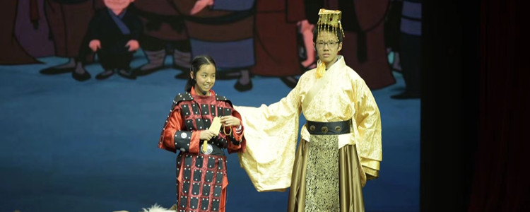英文短剧《花木兰》中花木兰和皇帝扮演者金若涵、黄冠植同学