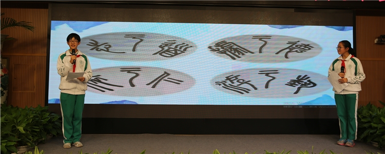 初1912班的何秉原和吕逸格同学首先上台展示了本班的班徽,从班徽的设计理念和意象出发,解读了初1912班的班级文化。初1912班以《论语》中的“志于道,据于德,依于仁,游于艺”为班训,从“学”“逸”“劳”三个方面介绍了班级的特色,从“言行一致”“遵守秩序”“自我管理”三个方向解读了班级的自治承诺,同时邀请亲友团上台一起回答了老师的提问。