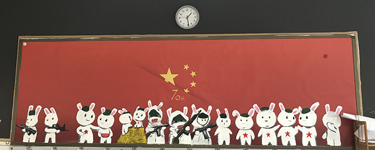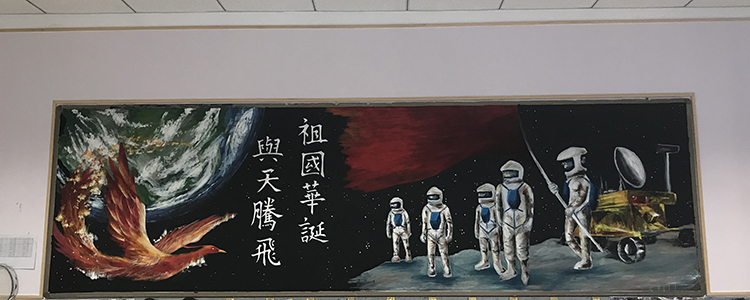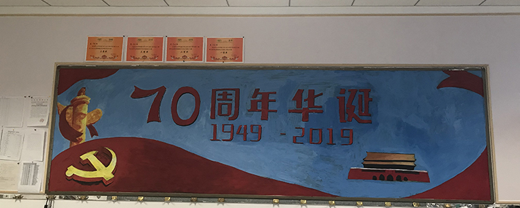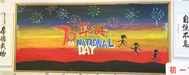 为热烈庆祝新中国成立70周年,9月校团委组织全校各班开展“班级空间文化评比”活动,其中包括“峥嵘七十载,逐梦新时代”主题黑板报设计,要求各班后黑板板报内容要以“我和我的祖国”、“峥嵘七十载,逐梦新时代”、“我为祖国点赞”等突出国庆热烈氛围的主题展开设计。经过一个月的筹备和设计,初高中各班都完成了板报绘制工作。