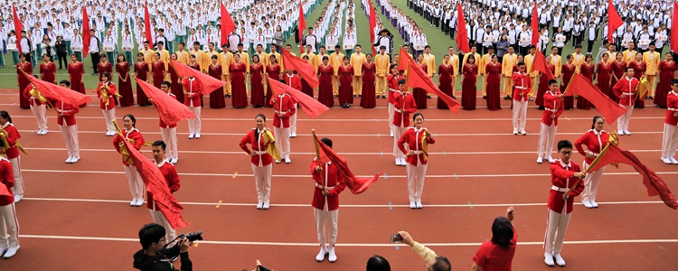 参加开幕式的领导与全场师生一起升国旗唱国歌