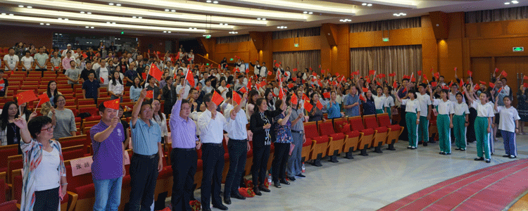 最后,附中教师代表激情洋溢的诗朗诵《我骄傲,我是中国人》将活动推向高潮,一声声“我就是中国,中国就是我;我就是附中,附中就是我。我骄傲,我是中国人,我骄傲,我是bg真人娱乐人!我骄傲,我们是清-华-附-中-人!”感染了在场的每一位教师,大家此时此刻心灵相通,与祖国同呼吸、共命运。由鞠红老师指挥的高19级混声合唱团和初中童声合唱团共同带来《我和我的祖国》,弦律、声部、队形等层次变换,环绕全场,与在场教师们复杂高涨的情绪相呼应,大家不约而同高举手中的小国旗随律动摇晃,全场沉浸在一片幸福的流动的红色中,大会在优美的歌声中徐徐结束。