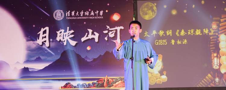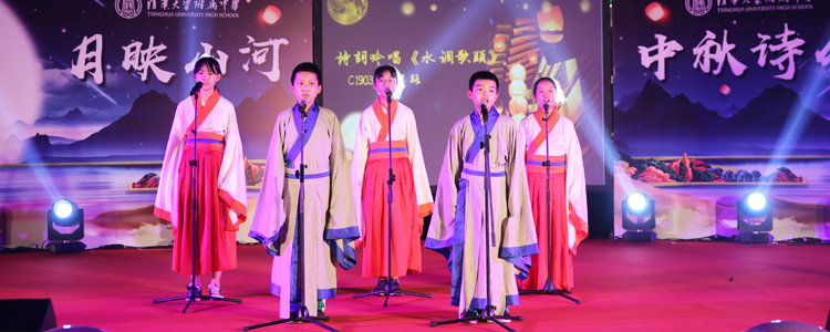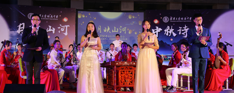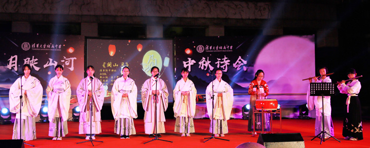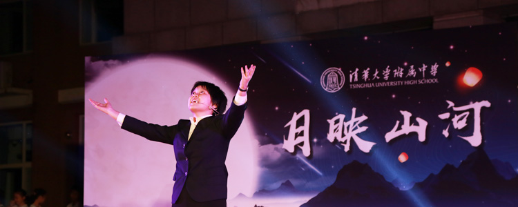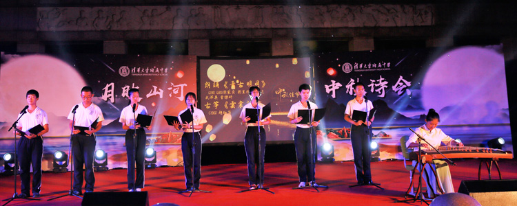 在“朗月伴人归”一章中,王殿军校长、张洁副书记和政史地教研组联合党支部的老师们为大家带来了朗诵《五千年一轮满月》,同学们看到老师表演的节目,欢呼喝彩声不断。接下来的两个诗词吟唱节目:《关山月》和《水调歌头》,浅吟低唱,古韵悠扬,余音绕梁,不绝于耳。古筝声里《云裳诉》,《千古明月》细细说,精彩的朗诵将中华文化的深厚底蕴表达得唯美隽永。