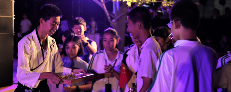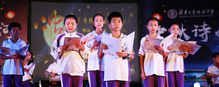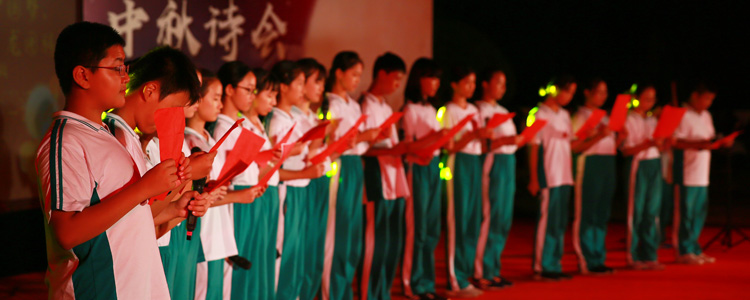 朦胧月色中,诗会进入到第二篇章——“月是故乡明”。中秋是团圆的节日,亦是丰收的开始,舞蹈团的几位同学月下起舞,于光影交错中翩翩演绎《大地的回响》,电声乐队一曲《西湖》,仿佛将现场的观众带到了西湖畔,荷花边,幽草旁,亭台上。中秋之夜,小家团圆,大家亦圆满。长笛古筝声里,大小提琴乐中,既有古韵悠扬的《月照故园映九州》,也有激情澎湃的现代诗篇——《我骄傲,我是中国人》。在《夕阳山顶》的配乐中,初一年级的新生们气势如虹,高声唱响《中国梦·龙图腾》,小提琴手的琴弓拉出的是壶口瀑布的奔腾汹涌,“我的乌骓马的嘶鸣、我的大风歌的唱响,我的一统天下的秦始皇,我的溢满诗歌和酒香的盛唐……”话剧社的同学们“举杯邀明月”,在另一个时空与李白对饮。唐王朝的巍巍大厦在安史乱军的马蹄声中坍塌,诗人李白满怀爱国热忱进入永王幕府,壮志凌云却未能洞烛其奸。不久,永王谋败身亡,李白获罪被执,诏判长流夜郎,而后裹挟一路风尘到达白帝城。李白遇赦后,当涂的山水淡薄了李白的热望,但平乱最后一战的召唤却又鼓荡起诗人报国的激情,他做出了骇人听闻的惊世壮举:以垂暮之年请缨从军。现场的师生都沉浸在小演员的精彩演绎中,话剧的结尾,一叶扁舟漂流在大江月色中,诗人悄然逝去,令人感慨不已。台下响起轻轻的叹息声,“举杯邀明月,对影成三人。”小小的孩子理解了大诗人李白洒脱背后的落寞。