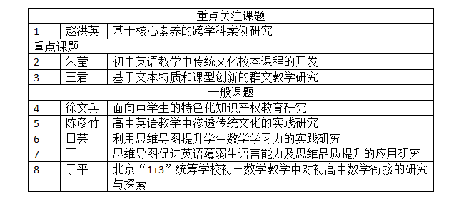 2019年9月10日,海淀区“十三五”教育科学规划课题评审结果揭晓,bg真人娱乐8位教师主导的课题立项成功。其中含一项重点关注课题,两项重点课题和五项一般课题,分属特级教师专项、学科带头人/骨干专项、学校副校长及中层干部专项、教研组长专项和学科教师专项,内容覆盖学科教学、课改实践、课程管理、德育教育、后勤保障等方方面面,在海淀区同类学校中名列前茅。