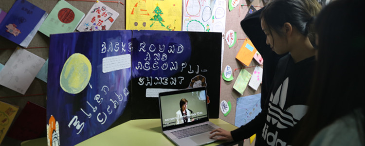 学生们通过自己做的展板和视频向大家展示科学家或科学现象