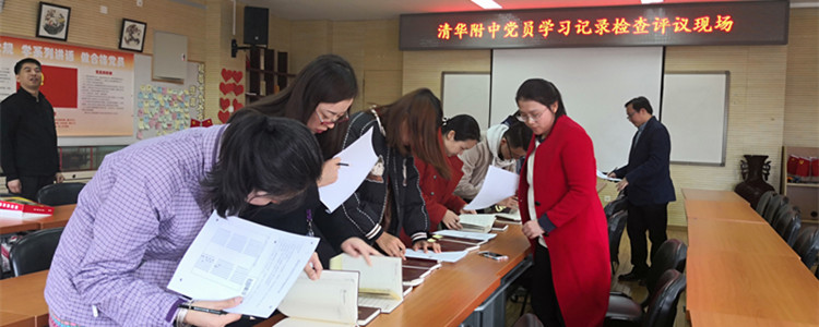 附中党委首先成立检查小组,组长党委副书记张洁、副组长党办主任党胜军,6个在职党支部宣传委员、组织委员为评委。根据党支部评价方案的具体要求形成党员学习记录本的评价标准和评分方式。在检查小组的统一部署下,各党支部随机抽取包括领导干部在内的全体党员学习记录本的三分之一。党办统一匿名编号后,3月14日中午全体评委集中评议近50本学习记录本。