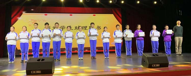 接着,伊娜老师宣读了年级表彰名单,表彰了上学期在班级服务、文明礼貌、积极进取等多方面表现突出的同学,并分别由白雪峰副校长、王田主任和张彪老师为获奖同学与学生助理颁发了奖状和聘书。其间,获奖学生代表龙飞宇、学生助理代表黄哲雯分别发言,倡导同学们自觉遵守日常行为要求,不断提高自身修养,心怀梦想,为班级和年级贡献自己的一份力量。