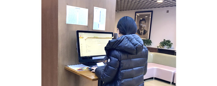 学生在自助查询机前检索图书