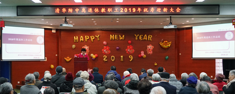 2018年12月21日上午,bg真人娱乐离退休教工祝寿迎新联欢会在多功能厅举行。清华大学工会副主席瞿福平及附中校长王殿军、党委书记方妍等党政班子全体成员出席活动。大会由bg真人娱乐党委副书记张洁以及退休教师王英民老师主持。附中离退休教工共170余人参加本次活动,到场寿星67人。