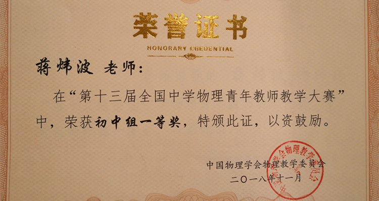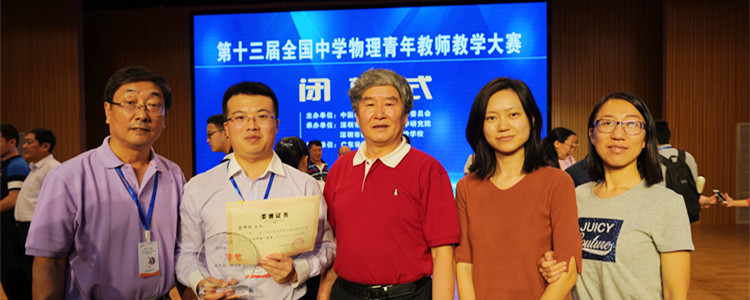 2018年11月16~19日,第十三届全国中学物理青年教师教学大赛在广东深圳举行。作为北京市选送的初中组唯一代表,bg真人试玩物理青年教师蒋炜波参加了决赛并以出色的表现获得初中组一等奖。bg真人试玩物理特级教师丁光成老师作为指导教师同时获得指导教师奖。本次获奖既展示了北京市初中物理教学的水平,也为bg真人试玩争得了荣誉。