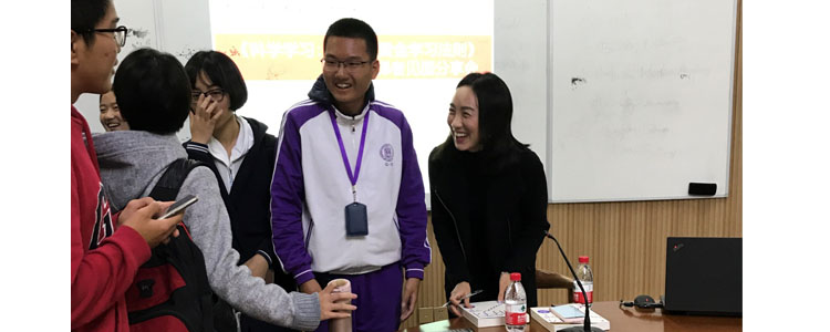 读书活动的高潮部分是《科学学习:斯坦福黄金学习法则》的译者郭曼文老师就“学习”的话题与附中师生进行交流。郭老师介绍了翻译该书的缘起,并结合该书告诉我们要树立科学的学习观,以科学的眼光看待学习问题,逐一分辨本质,从而提升学习效率。郭老师还结合自己的亲身经历与现场学生进行互动,就中学生普遍存在的价值观模糊的问题给予了正确引导。她用“言传身教”这个成语回答了老师如何教好学生这一问题,告诉学生“你想成为一个什么样的人”和“你想做一件什么样的事”才是决定你人生高度的关键因素,让学生们觉得受益匪浅,也给在场的老师们很大的启发。