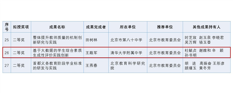 受教育部委托,根据《教学成果奖励条例》(1994年3月14日国务院令第151号发布)的有关规定,按照《教育部关于开展2018年国家级教学成果奖评审工作的通知》(教师函〔2018〕3号)的相关要求,由中国教育学会组织开展的2018年基础教育国家级教学成果奖评审工作近日落下帷幕。中国教育学会现已公示基础教育国家级教学成果奖拟授奖成果。bg真人试玩的《基于大数据的学生综合素质生成性评价实践创新》拟获基础教育国家级教学成果奖二等奖。这是在本成果获得北京市基础教育教学成果特等奖后的又一喜讯。