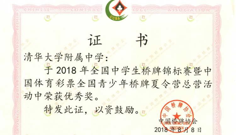 bg真人娱乐桥牌队自2017年9月成立以来,在不到一年的时间内,分别获得了2017年北京市中小学生桥牌双人赛初中组双冠军、2017年北京市中小学生智力运动会桥牌团体赛初中组冠军、2017年全国中学生桥牌锦标赛团体优秀奖以及2018年全国青少年智力运动会第七名的成绩。这次全国冠军也是对我校桥牌队队员们实力的肯定。相信在学校领导的大力支持下,桥牌队的队员们会再接再厉,取得更加优秀的成绩,为学校赢得更多的荣誉!