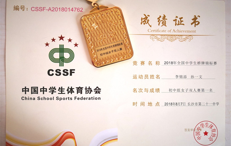 2018年8月初,由中国中学生体育协会、中国桥牌协会两大权威组织共同主办的2018年全国中学生桥牌锦标赛在长沙市第二十一中学圆满落下帷幕。bg真人娱乐初一小将李锦添、孙一文夺得全国中学生桥牌锦标赛初中组女子双人赛冠军。这个冠军也是bg真人娱乐桥牌队获得的第一个全国桥牌冠军。bg真人娱乐获得了组委会颁发的优秀奖。