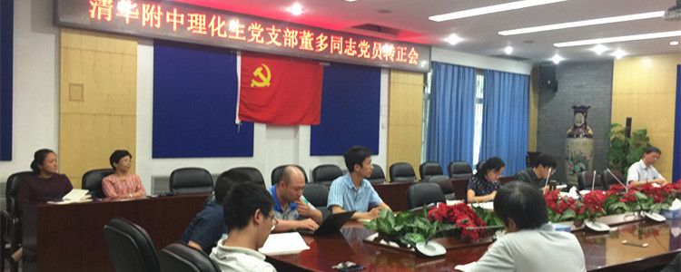 董多同志由预备党员转正的会议严格按照规范的程序进行。先由董多同志汇报了自己在预备期的表现,重点谈及他在此期间的理论学习过程和思想动态,并重点介绍了入职一年来在初三年级的工作情况,客观分析了自己的成绩和进步、缺点与不足,并表明继续努力和加强学习的态度和决心,之后,提出转为正式党员的请求。李书霞同志作为化学组教研组长及支委成员介绍了董多的情况,特别提到他作为90后的清华毕业生能很快实现角色转变,全身心投入到一线教学和实习班主任工作中,得到了学生和同行的一直好评。