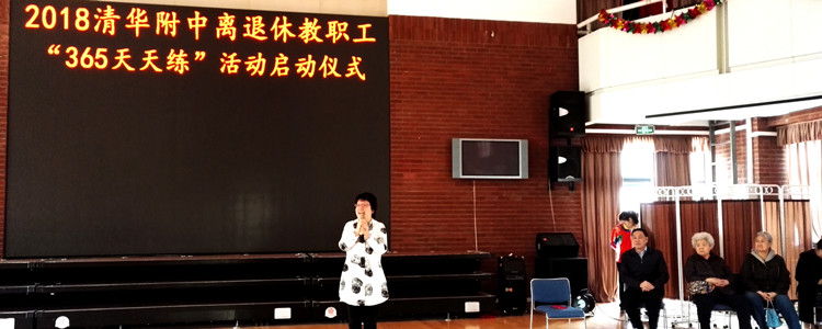 张洁副书记首先向大家解释了启动仪式安排在多功能厅的原因,并简单总结了2017年离退休教师参加体育锻炼的情况以及附中举行离退休同志“365天天练”活动的意义。同时,号召大家积极参与到健身活动中来。