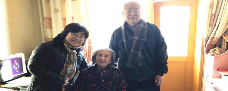 副校长赵鸿雁(左1)和离退休党支部书记王锡祥(右1)看望张秀真老师