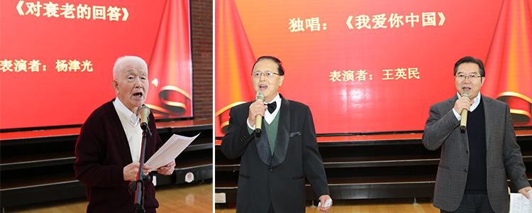 杨津光老师表演诗朗诵(左图) 王英民老师(右图左)、王殿军校长演唱《我爱你中国》
