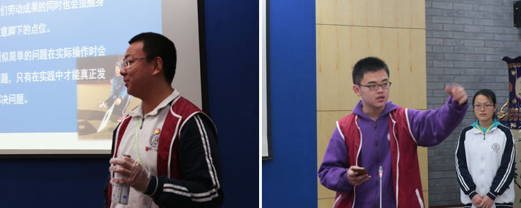 本周参加“水木行动”的高1613班同学分别从校园卫生清扫、食堂秩序维护、课间操管理、晚自习管理等方面做了详尽的汇报。参与活动的同学们都表示,第一次扮演学校管理者的角色,既体验到了为同学们服务的美好,也体会到了学校管理的不易,以管理者身份发现校园里存在的不文明行为后,更能以此反思自己的言行。在水木行动的例行事项外,高1613班同学发挥主观能动性,承担了学校操场的“喷漆”活动。负责此项活动的徐焕昌同学表示,“通过喷漆,我体会到了总务师傅们的辛苦,也明白了看似简单的问题在实际操作时会遇到很多问题,只有在实践中才能真正发现问题、解决问题。”