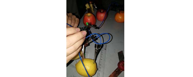 原来,苹果、橙子、柠檬等水果里含有酸性离子,凡是酸性水果都能发电。两种电化学活性不一样的金属片,其中金属特性更活泼的金属片能将水果中的酸性物质置换出氢离子,产生正电荷,从而形成电流。