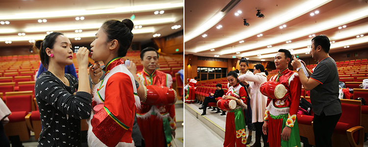 舞指赵茜(前左)为演员化妆(左图) 音乐教师高山(右1)以及工会孙玉华、周灵老师等为演员化妆(右图)
