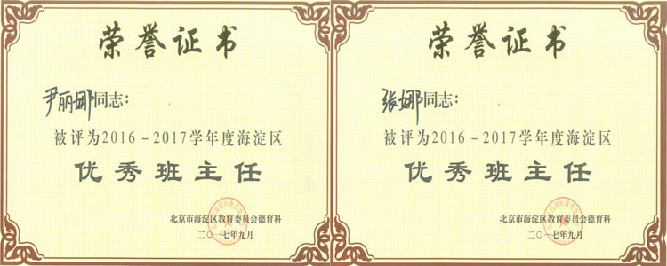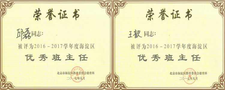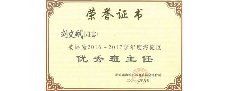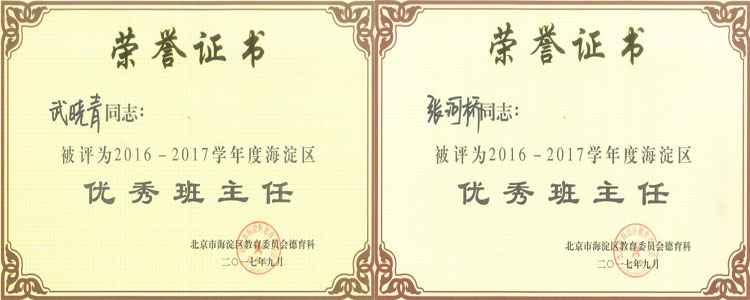 10月11日,2016-2017学年度海淀区“优秀班主任”评选结果揭晓,bg真人娱乐刘文斌、邱磊、王歆、武晓青、张河桥、尹丽娜、张娜7名老师获此殊荣。