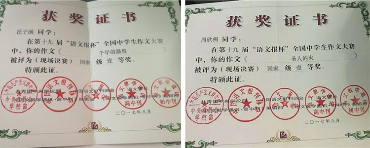 2017年8月11~13日,全国第19届 “语文报杯”现场作文大赛在太原举行,bg真人试玩高1611班周欣桐同学的《圣人的火》、汪子涵同学的《千年的温度》在“冷与热”的作文题中,分别获得国家级一等奖。