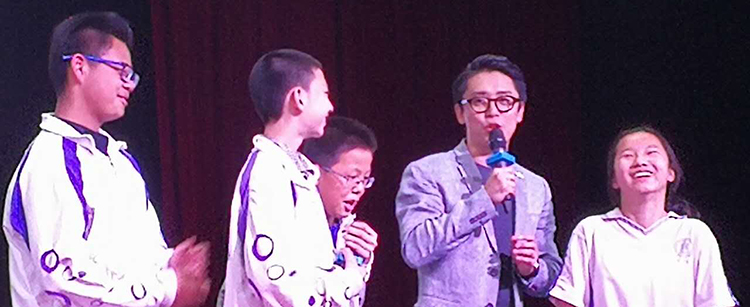主持人路伦一(右2)在与同学互动