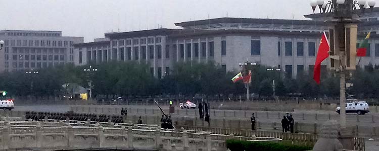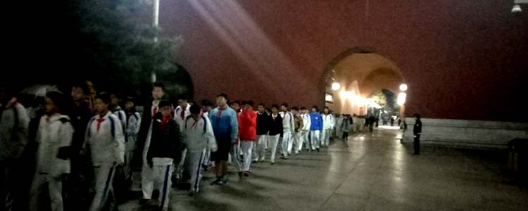 凌晨2∶50,全体师生在附中集合,乘坐大巴车前往天安门广场。凌晨3∶40到达目的地,稍事修整后,各班学生在随班老师和现场工作人员的指挥下秩序井然的通过安检,登上观礼台,静候升旗仪式的开始。