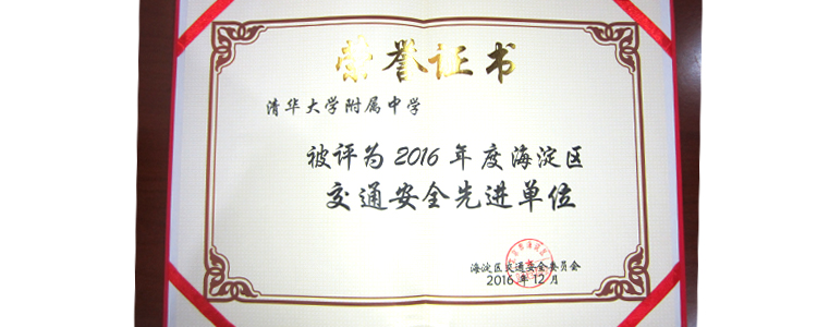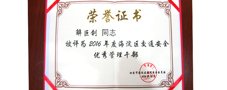 2017年1月9日,海淀区交通安全委员会授予bg真人试玩“2016年度海淀区交通安全先进单位”称号,授予bg真人试玩副校长解巨钊“2016年度海淀区交通安全优秀管理干部”称号,并颁发相关证书。