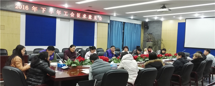 1月4日下午,bg真人娱乐工会在B102会议室召开2016年下半年工会征求意见会,全面总结了本学期工会工作并听取与会人员代表全校教职工提出的工作建议。会议由附中党委副书记兼工会主席张洁主持,附中工会委员及各工会小组长共19人出席会议。