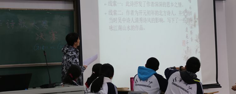 本次决赛共分为1.线索题(给出相关线索提示猜诗句);2.看图猜诗题;3.诗歌鉴赏题;4.诗歌朗诵;5.诗歌创作五个环节。五个环节中的这些题目,是由学生与老师共同精心策划与完成的,充分的考验了同学们的文学积累与底蕴,也考察着他们的理解能力、思考能力等多方面的综合能力。