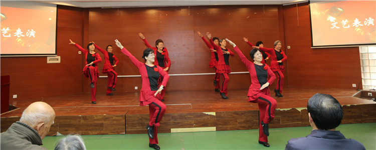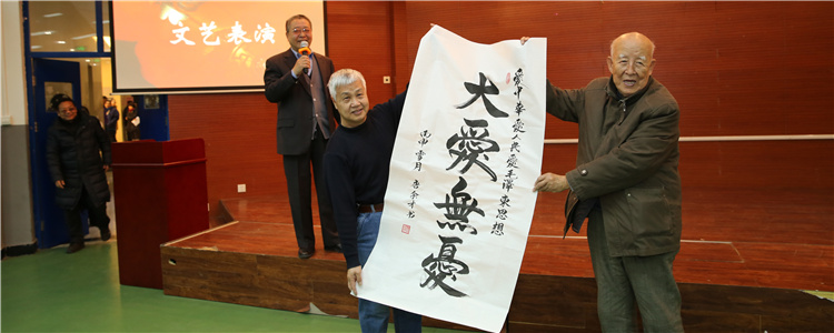 文艺演出由王武镝老师主持。老同志们表演了歌曲、舞蹈、诗歌朗诵、京剧清唱,附中健身操队的老师们集体表演了新疆健身操……一个个节目赢得与会同志们阵阵热烈的掌声。为给老教师添寿,退休教师唐余才特意写了一幅字,送给出席本次大会年龄最大的冯玉中老师。最后,由工会体育委员张国梅老师带领大家学做老年健身操。