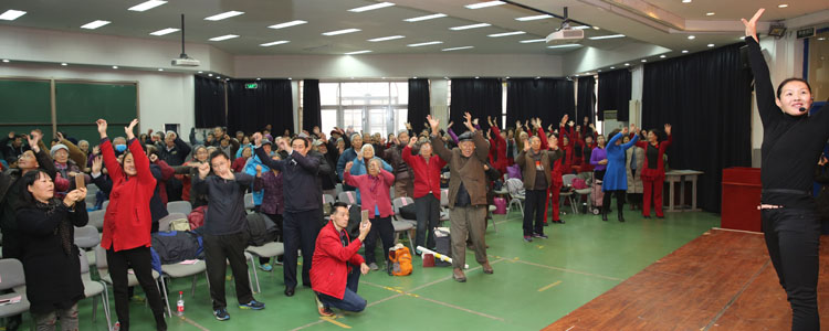 全体参会人员在张国梅教练的带领下一起做《老年养身操》