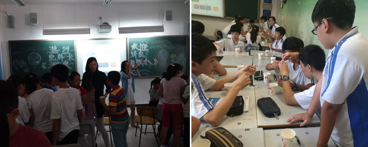 之后,进行小组活动,沈艳辉向每个小组分发试剂,指导同学们亲手调配各种饮料,在实践中加深了学生对于健康饮水认识,也培养了学生的探究精神。