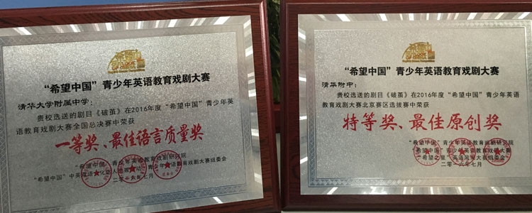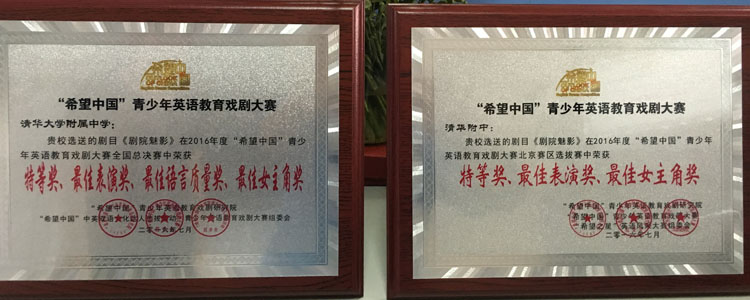 9月17日,2016年度第七届“希望中国”青少年英语教育戏剧大赛全国总决赛结果揭晓,bg真人试玩学生取得优异成绩。其中,高1413班同学上演的《歌剧魅影》(The Phantom of the Opera)荣获大赛特等奖,同时获得“最佳表演奖”、“最佳语言质量奖”和“最佳女主角奖”;由高1404班同学自编、自导、自演的《破茧》(Liberation),荣获大赛一等奖,同时还获得“最佳语言质量奖”。另外,鲁碧珍、易春丽两位老师均获得“最佳指导教师奖”。在此前进行的北京赛区的选拔赛中,《歌剧魅影》剧组荣获特等奖,最佳表演奖和最佳女主角奖;《破茧》剧组荣获特等奖和最佳原创奖。